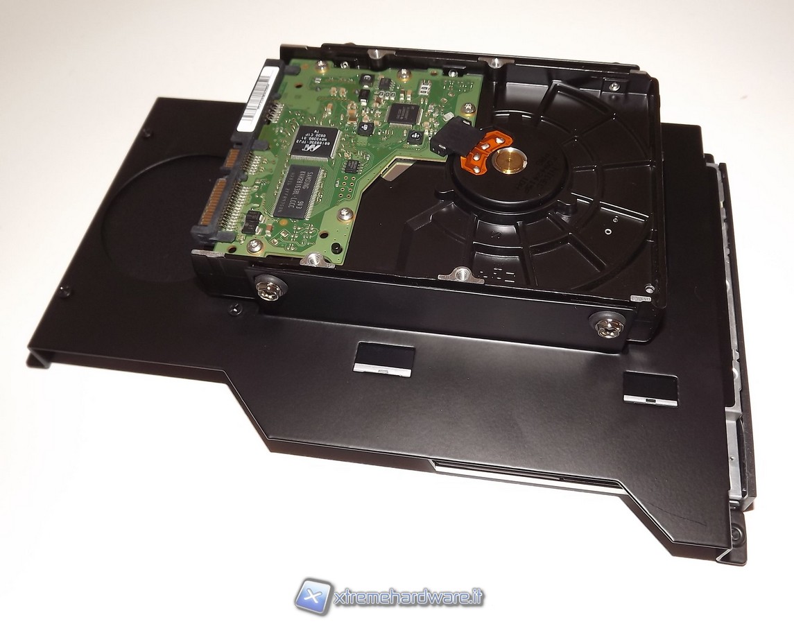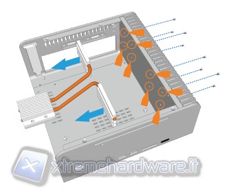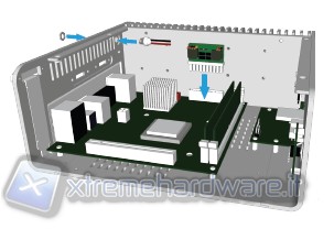 Per accedere all'interno dello chassis è necessario togliere il coperchio superiore. E' sufficiente rimuovere 4 viti, 2 poste sul fondo ed altre 2 poste sulla fiancata destra dove è presente il sistema Heatsink lamellare. In questo modo si può togliere con facilità il coperchio superiore, il quale fa corpo unico con la fiancata sinistra. Successivamente procederemo a sfilare dall'interno il rack porta HDD/ODD, in questo caso occore svitare le 4 viti che sono presenti nella parte superiore e sfilare la HDD/ODD cage dal suo alloggio.